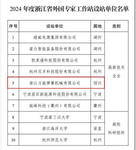 19th 12.2024 在全球化與科技創新的驅動下,浙江省外國專家工作站成為吸引國際高端人才、推動企業創新發展的重要平臺。自2020年《浙江省外國專家工作站管理辦法》實施以來,紹興市在吸引外籍專家方面取得了顯著成績。截至目前,紹興市已有6家單位獲批為省級外國專家工作站,位居全省前列。 2024年,浙江萬能彈簧機械有限公司榮...
